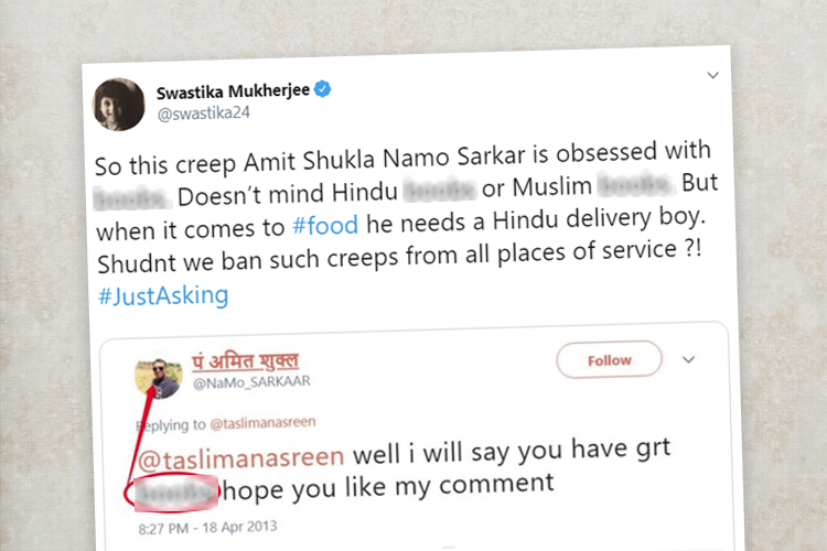 তবে এ সব টুইট ও পাল্টা টুইটের মধ্যে যাননি স্বস্তিকা। তিনি তুলে এনেছেন অমিত শুক্লর অন্য একটি অশ্লীল পোস্ট। দেখিয়ে দিয়েছেন, অমিতের তথাকথিত রক্ষণশীলতার মধ্যে আসলে লুকিয়ে আছে বিকৃতমনস্কতাও। দুটো প্রসঙ্গকে এক বিন্দুতে মিলিয়ে অভিনেত্রীর প্রশ্ন: ‘নারীদেহের ওই বিশেষ অঙ্গের প্রশংসার সময় অমিত শুক্লর জাতপাতের কথা মাথায় থাকে না। শুধু খাবারের বেলায় তাঁর হিন্দু ডেলিভারি বয়ের প্রয়োজন হয়?’ নেটিজেনদের কাছে স্বস্তিকার জিজ্ঞাসা, ‘এই ধরনের মেরুদণ্ডহীন প্রাণীদের সমাজের সব স্তর থেকে নিষিদ্ধ করা উচিত নয় কি?’