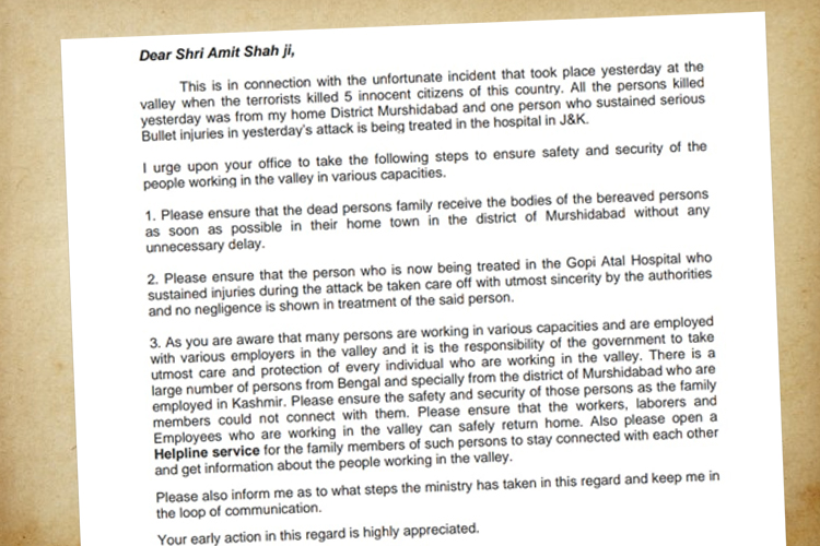 পরে এই গোটা বিষয় নিয়েই কেন্দ্রীয় স্বরাষ্ট্রমন্ত্রী অমিত শাহকে একটি চিঠি লেখেন। তাতে তিনি মূলত তিনটি বিষয়ের উল্লেখ করেছেন। প্রথমত, নিহত শ্রমিকদের দেহ মুর্শিদাবাদের বাড়িতে পৌঁছতে যাতে অযথা দেরি না হয়, তা দেখার জন্য বলেছেন স্বরাষ্ট্রমন্ত্রককে। ঘটনায় পাঁচ জনের মৃত্যুর পাশাপাশি এক জন আহত হয়েছেন। তাঁর চিকিৎসায় যাতে যথাযথ ব্যবস্থা নেওয়া হয়, সেই বিষযটি উল্লেখ করেছেন চিঠিতে। এছাড়া মুর্শিদাবাদের বিভিন্ন প্রান্ত থেকে কাশ্মীরের নানা জায়গায় কাজ করতে যাওয়া শ্রমিকদের নিরাপতত্তা দেওয়ার দাবিও জানিয়েছেন অধীর। প্রধানমন্ত্রীকেও চিঠি পাঠিয়ে উদ্বেগ প্রকাশ করেছেন অধীর।
