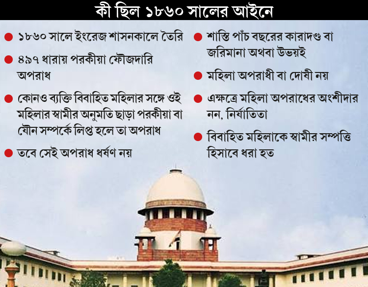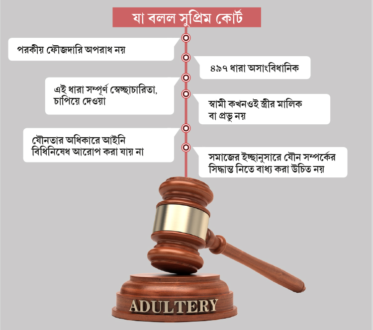 প্রধান বিচারপতি দীপক মিশ্রের নেতৃত্বাধীন বেঞ্চ আজ ভারতীয় দণ্ডবিধির ৪৯৭ ধারা এবং ফৌজদারি কার্যবিধির ১৯৮ ধারাকে অসাংবিধানিক ঘোষণা করে জানাল, ‘‘স্বামী কখনওই স্ত্রীর প্রভু হতে পারে না।’’ আদালতের সিদ্ধান্ত, পরকীয়া কোনও শাস্তিযোগ্য অপরাধ নয়। বিবাহবিচ্ছেদের ক্ষেত্রে পরকীয়া অবশ্যই খুব গুরুত্বপূর্ণ কারণ বলে বিবেচিত হবে। স্বামী-স্ত্রীর মধ্যে কেউ অন্যের পরকীয়ার জেরে আত্মহত্যা করলে প্রমাণসাপেক্ষে তা আত্মহত্যায় প্ররোচনা হিসেবেও গণ্য হবে। কিন্তু বিবাহিতা নারীর সঙ্গে পরকীয়া সম্পর্কে জড়ালে পুরুষের পাঁচ বছর কারাদণ্ড বা জরিমানা বা দুইই হওয়ার যে আইন ছিল এত দিন, তা আর বলবৎ থাকবে না।