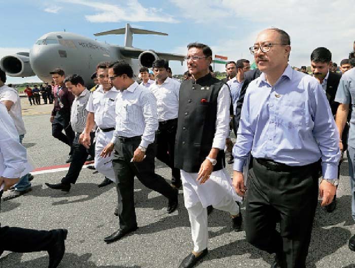 রোহিঙ্গাদের জন্য ত্রাণ নিয়ে ভারতীয় বায়ুসেনার বিমান নামল চট্টগ্রামে। বৃহস্পতিবার বিমানবন্দরে ভারতীয় হাইকমিশনার হর্ষবর্ধন শ্রিংলা ও বাংলাদেশের সড়ক-সেতু মন্ত্রী ওবায়েদুল কাদের (ডান দিক থেকে প্রথম ও দ্বিতীয়)। নিজস্ব চিত্র