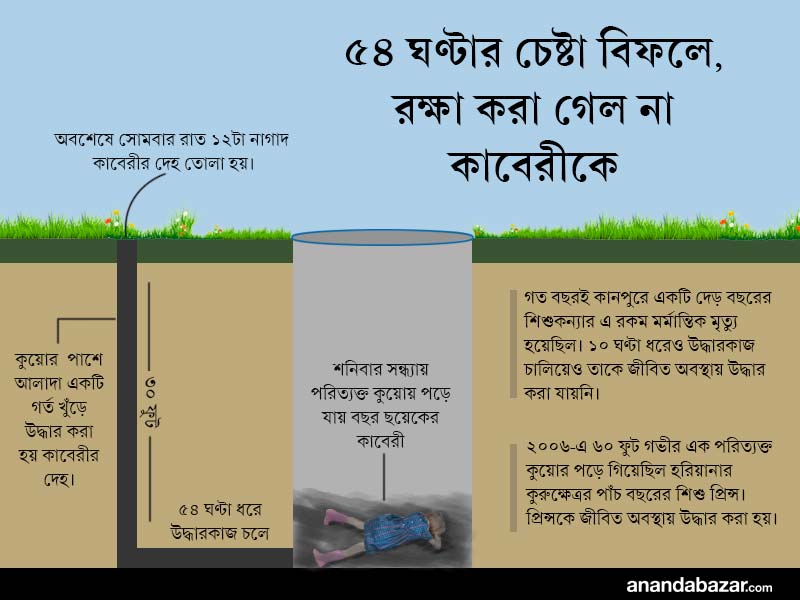 বন্ধুদের সঙ্গে খেলতে খেলতে হুঁশ ছিল না কখন সন্ধ্যা হয়ে এসেছে। খেলতে খেলতেই গ্রামের বাড়ি থেকে একটু দূরে চলে গিয়েছিল ছোট্ট কাবেরী। সেখানেই একটি কুয়োয় পড়ে যায় সে। বেশ গভীর হলেও প্রবল গ্রীষ্মে ওই কুয়োয় জল শুকিয়ে গিয়েছিল। সেই কুয়োর গভীরে ৩০ ফুট নীচে কাদামাটির মধ্যেই আটকে পড়ে বছর ছয়েকের কাবেরী। প্রায় ৫৪ ঘণ্টা চেষ্টা চালিয়েও তাকে জীবিত অবস্থায় উদ্ধার করা যায়নি। অবশেষে সোমবার রাত ১২টা নাগাদ তার মৃতদেহ উদ্ধার করে জাতীয় বিপর্যয় মোকাবিলা বাহিনীর সদস্যেরা।