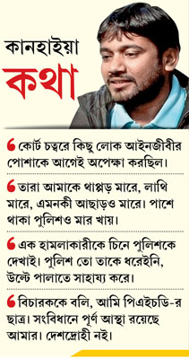 জেএনইউ কাণ্ডে সে দিনই প্রথম আদালতে পেশ করা হয়েছিল কানহাইয়াকে। তাঁর কথায়, ‘‘গাড়ি থেকে শুধু নামার অপেক্ষা। মুহূর্তে ঘিরে ফেলেছিল ভিড়টা। উড়ে আসছিল কিল-চড়-ঘুষি। সঙ্গে গালিগালাজ-হুমকি। কেউ একটা তুলে আছাড়ও মারল আমায়। লাথি খেলাম পেটে। দু’হাতে মাথা ঢেকে বেশ কিছু ক্ষণ মার খাওয়ার পর এক জন পুলিশ কোনও মতে আমায় ঢুকিয়ে দিলেন আদালতে। প্রাণে বাঁচলাম! পাশে থাকা এক পুলিশকর্মীও মারের হাত থেকে রেহাই পাননি।’’