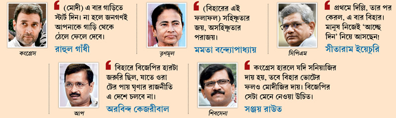 ভোটের ফল প্রকাশের পর রাজনৈতিক বিশ্লেষকদের কেউ কেউ দাবি করতে শুরু করেছেন, এ বার প্রধানমন্ত্রী পদের দাবিদার হয়ে উঠলেন নীতীশ। তাঁর নেতৃত্বে তৃতীয় ফ্রন্ট গঠনের সম্ভাবনাও তৈরি হয়ে গেল। কিন্তু কংগ্রেস নেতাদের মতে, আপাতত বিহারে সুশাসন কায়েম করতে হবে নীতীশকে। জাতীয় স্তরে কংগ্রেসই এখনও প্রধান বিরোধী শক্তি। রাহুল নিজেও সেটা বুঝিয়ে দিয়েছেন আজ। সর্বভারতীয় স্তরে মোদী-বিরোধী লড়াইয়ের প্রধান মুখ হয়ে উঠতে চেয়েই এ দিন প্রধানমন্ত্রীকে সরাসরি হুমকি দেন রাহুল। বলেন, ‘‘দম্ভ, রাগ ছেড়ে এ বার কাজে মন দিন মোদীজি। লন্ডন, আমেরিকা ঘুরে বেড়ানোও বন্ধ করুন। তার বদলে কৃষক-মজুরের সঙ্গে দেখা করুন। নইলে যে গাড়ি চেপে ঘুরে বেড়াচ্ছেন, জনতা সেখান থেকে ধাক্কা দিয়ে আপনাকে নামিয়ে দেবে।’’ সেই সঙ্গে মোদী, বিজেপি ও সঙ্ঘকে তাঁর হুঁশিয়ারি, ‘‘হিন্দু-মুসলমানে লড়াই লাগিয়ে দিয়ে ভোটে জেতা যায় না। এ সব বন্ধ করুন।’’