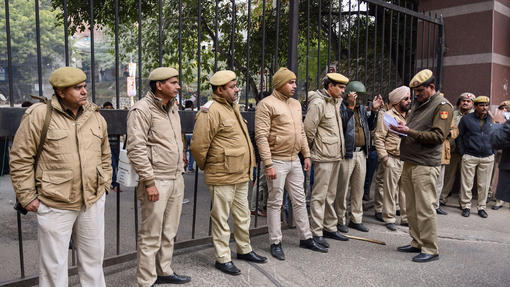 সোমবার জেএনইউ ক্যাম্পাসে নিরাপত্তা বেষ্টনী পুলিশের। ছবি: পিটিআই