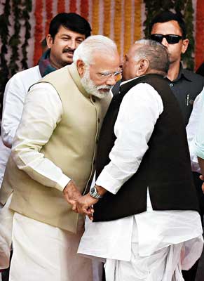 যোগী আদিত্যনাথের শপথে এক মঞ্চে নরেন্দ্র মোদী ও মুলায়ম সিংহ যাদব। রবিবার। ছবি: পিটিআই