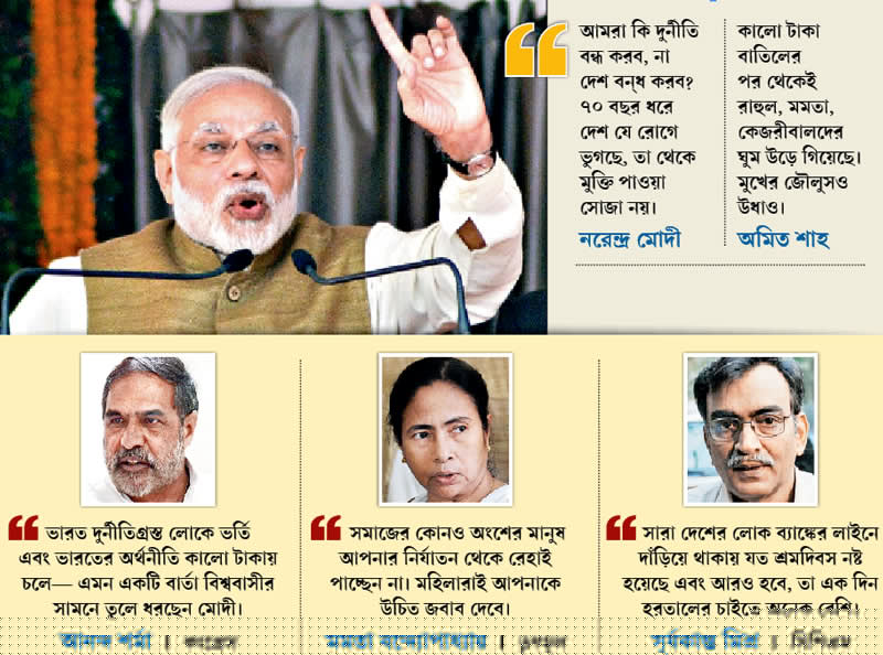 সংসদের পাশাপাশি আগামিকাল দেশ জুড়ে ‘আক্রোশ দিবস’ পালন করবে কংগ্রেস। কলকাতায় পথে নামছেন মমতা। নোট বাতিলের প্রশ্নে কাল হরতাল ডেকেছে বামেরা। বিরোধী শিবিরের বক্তব্য, নতুন মাসের শুরুতে জনতার সমস্যা আরও চরমে উঠবে। গ্রামীণ এলাকায় টাকার টান পড়ায় বীজ কেনার সমস্যা রয়েছে। প্রভাব পড়ছে অসংগঠিত শিল্পে। কানপুরে চামড়ার ব্যবসায়ীরা কাঁচামালের অভাবে ট্যানারি বন্ধ করে দিতে বাধ্য হয়েছেন। মার খেতে শুরু করেছে বস্ত্র শিল্প। পরিকাঠামো ক্ষেত্রেও শ্রমিকেরা কাজ পাচ্ছেন না। কমছে উৎপাদনের হার। তার মধ্যেই সামনে নতুন মাস। মাসপয়লা থেকে টাকার জোগানের অভাবে সমস্যার মুখে পড়তে চলেছেন মধ্যবিত্ত, নিম্ন মধ্যবিত্ত শ্রেণি। মুদির দোকান থেকে দৈনিক বাজার— নগদের অভাবে প্রবল সঙ্কটের আশঙ্কা তৈরি হয়েছে। আমজনতার সেই ক্ষোভকে হাতিয়ার করেই মোদীর বিরুদ্ধে নতুন মাসের শুরুতে সর্বাত্মক লড়াইয়ে নামার প্রস্তুতিতে ব্যস্ত বিরোধী শিবির।