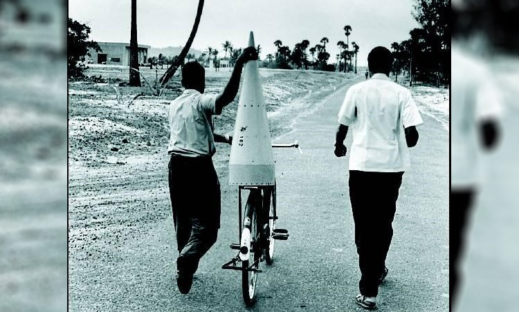 ভারতের প্রথম রকেট। উত্ক্ষেপণের আগে সাইকেলে করে নিয়ে যাচ্ছেন এপিজে আব্দুল কালাম।— ফাইল চিত্র।