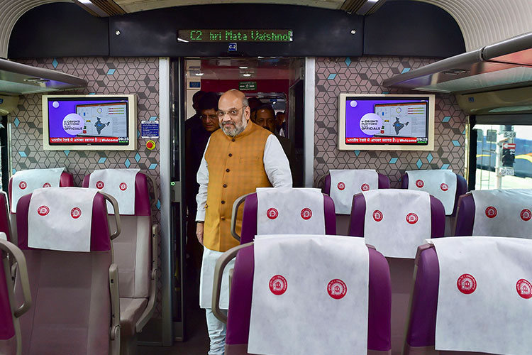 বন্দে-ভারত এক্সপ্রেসের ভিতরে ঘুরে দেখছেন অমিত শাহ। ছবি: পিটিআই