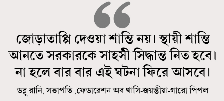যে বাসচালকের নাবালক পুত্রদের মারধর থেকে ঘটনার সূত্রপাত, সেই মারবানিয়াং কিন্তু জানাচ্ছেন, তাঁর ছেলেদের আঘাত তেমন গুরুতর নয়। খাসি বনাম পাঞ্জাবির লড়াই মোটেই হয়নি। আন্দোলনের কারণ অন্য। ফেডারেশন অব খাসি-জয়ন্তীয়া-গারো পিপলের সভাপতি ডব্লু রানির মতে, ‘‘জোড়াতাপ্পি দেওয়া শান্তি নয়। স্থায়ী শান্তি আনতে সরকারকে সাহসী সিদ্ধান্ত নিত হবে। না হলে বার বার এই ঘটনা ফিরে আসবে।’’