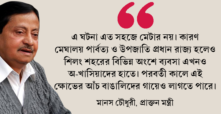 তবে, মানসবাবু বলেন, “এ ঘটনা এত সহজে মেটার নয়। কারণ মেঘালয় পার্বত্য ও উপজাতি প্রধান রাজ্য হলেও শিলং শহরের বিভিন্ন অংশে ব্যবসা এখনও অ-খাসিয়াদের হাতে। বিভিন্ন আবাসিক এলাকায় বাঙালি, পাঞ্জাবি, মাড়োয়ারিদের বসত বেশি। কয়েকজন উপজাতি নেতা সেই এলাকাগুলিতেও আধিপত্য কায়েম করতে চাইছেন। তাই একটা পাঞ্জাবি লেন খালি করলেই সব সমস্য রাতারাতি মেটার নয়। পরবর্তী কালে এই ক্ষোভের আঁচ বাঙালিদের গায়েও লাগতে পারে।”