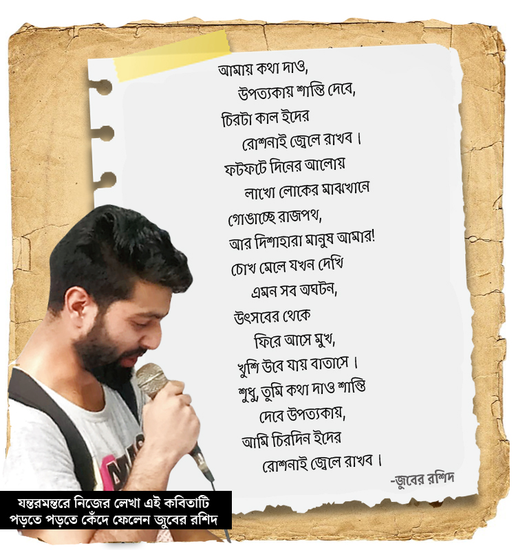 যন্তরমন্তরের ফুটপাতে শাকিরা আমিনের পিছনে সাদা কাপড়ে কালো রঙে জম্মু-কাশ্মীরের মানচিত্র। শুধুই জম্মু-কাশ্মীর। তার এক পাশে লেখা ‘আনহ্যাপি’ (বিষণ্ণ), অন্য পাশে লেখা ‘এগজ়াইলড’ (নির্বাসিত)। কাশ্মীরি ছাত্রছাত্রীদের ভিড়টাকে ঘিরে লোহার ব্যারিকেড। সতর্ক খাকি উর্দির পুলিশ। কালাশনিকভ উঁচিয়ে আধাসেনা।