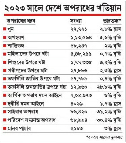 রিপোর্টে দেখা গিয়েছে, ২০২৩ সালে দেশে মোট অপরাধের মামলা হয়েছে ৬২.৪ লক্ষ। আগের বছরের তুলনায় বৃদ্ধির হার ৭.২%। প্রতি এক লক্ষ জনসংখ্যায় অপরাধের মাত্রা ছিল ৪৪৮.৩। ২০২২ সালে যে মাত্রা ছিল ৪২২.২। অপরাধের ধরনে পরিবর্তনও লক্ষ করা যাচ্ছে ওই রিপোর্টে। সাইবার অপরাধ ও শহরাঞ্চলে অপরাধমূলক ঘটনা বৃদ্ধি পাচ্ছে। ২০২৩-এ দেশে সাইবার অপরাধ বেড়েছে ৩১.২%। মেট্রোপলিটন শহরগুলিতে অপরাধের হার বেড়েছে ১০.৬%। সব থেকে বেশি মামলা হয়েছে দিল্লিতে। তফসিলি জাতির উপরে ঘটা অপরাধ সামান্য বৃদ্ধি পেয়েছে। তফসিলি জনজাতির উপরে অপরাধমূলক ঘটনা অনেক বেড়েছে (২৮.৮%)। যার অন্যতম কারণ হয়ে দেখা দিয়েছে মণিপুরের হিংসার মতো ঘটনা।