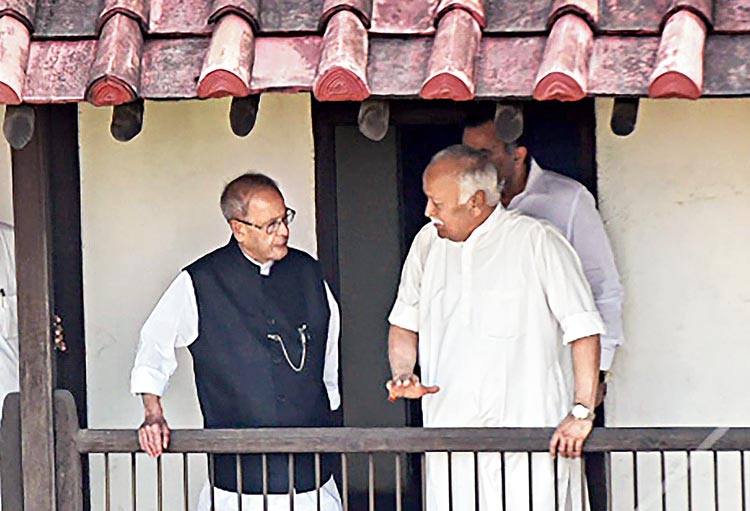 রাষ্ট্রীয় স্বয়ংসেবক সঙ্ঘের প্রশিক্ষণ শিবিরের সমাপ্তি অনুষ্ঠানে সঙ্ঘপ্রধান মোহন ভাগবত এবং প্রাক্তন রাষ্ট্রপতি প্রণব মুখোপাধ্যায়। ছবি: রয়টার্স।