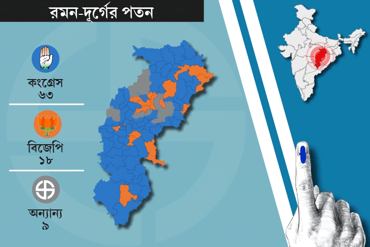 ‘চাউলবাবা’ রমন সিংহের এই পতনকে অবশ্যই ইন্দ্রপতন বলা যায়। এ বারেরবিধানসভা নির্বাচনে কংগ্রেস লড়তে নেমেছিল আক্ষরিক অর্থেই মুখ্যমন্ত্রী-মুখ ছাড়া। প্রদেশ কংগ্রেস সভাপতি ভূপেশ বাঘেল আর যা-ই হোন, ওজনে রমন সিংহের সঙ্গে পাল্লা দেওয়ার মতো নেতা ছিলেন না। কংগ্রেসের মূল ভরসা ছিল প্রতিষ্ঠান বিরোধিতা, ছিল বিজেপি সরকারের বিরুদ্ধে ওঠা ভূরি ভূরি দুর্নীতির অভিযোগ। এর সঙ্গে তীব্র ভাবে উঠেছে কৃষকদের ন্যূনতম সহায়ক মূল্য না পাওয়া, ক্রমবর্ধমান বেকারি, নোটবন্দির মতো জ্বলন্ত বিষয়গুলিও।