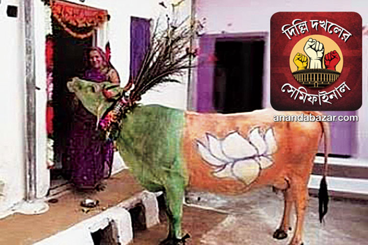 এখন? নিছক নিরীহ গৃহপ্রালিত প্রাণী নয়, গরু এখন ‘গোমাতা’। তিনি গোবর দেন, গোমূত্র দেন, দুধ দেন। সব মিলিয়ে, ভোট দেন।