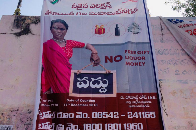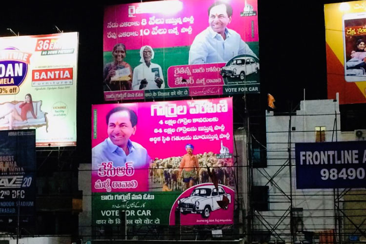 হায়দরাবাদ, সেকন্দরাবাদের মতো শহরের বেশ কিছু জায়গায় রয়েছে বড় বড় হোর্ডিং। ছোট ছোট হোর্ডিং রয়েছে মেট্রো রেলের স্তম্ভগুলিতে। এত দিন সে সবই শাসক দল তেলঙ্গানা রাষ্ট্র সমিতি (টিআরএস)-র ছিল। কিন্তু, নির্বাচনের দু’দিন আগে প্রচারের শেষ লগ্নে শহরের হাতে গোনা কয়েকটি জায়গায় পড়ল ‘প্রজা কুটামি’র হোর্ডিং। জেলা সদর বা গ্রামাঞ্চলের কোথাও শাসক দল ছাড়া কোনও বড় হোর্ডিং বা পোস্টার ছিল না। নতুন করে লাগানোও হয়নি। উল্টে প্রায় সর্বত্রই দেখা গেল নির্বাচন কমিশনের ব্যানার। যেখানে লেখা, ‘নো ফ্রি গিফ্ট, নো লিকার, নো মানি’। একই সঙ্গে, আগামী ৭ ডিসেম্বর নিজেদের পছন্দের প্রার্থীকে ভোট দেওয়ার জন্য কমিশনের অনুরোধ সম্বলিত ব্যানার টাঙানো হয়েছে।