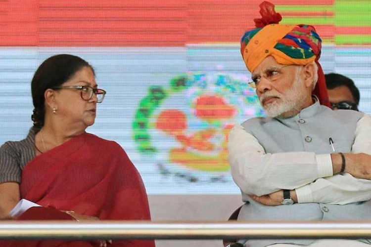 নির্বাচনী প্রচারে নরেন্দ্র মোদীর সঙ্গে বসুন্ধরা রাজে সিন্ধিয়া।—ফাইল চিত্র।