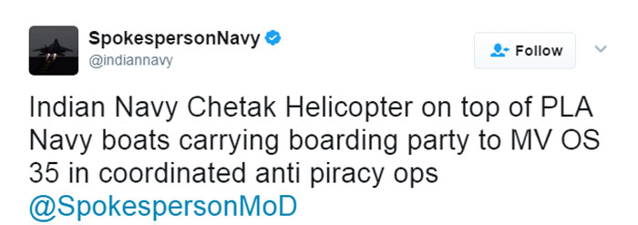 চেতক হেলিকপ্টার চক্কোর দেওয়ার ছবি প্রকাশ করা হয়েছে যে টুইটে, সেখানে এই কথা লিখেছে ভারতীয় নৌসেনা।