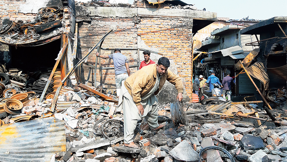 বাজারের ১৬৮ নম্বর দোকানটি শাহিদের। হাতে পোড়া লোহার তারের কুণ্ডলী। ম্লান হেসে বললেন, ‘‘চাকার স্পোক তৈরির জন্য রেখেছিলাম। সংসারের চাকাই বসে গেল। কী ভাবে যে ফের দোকান খাড়া করব, জানি না।’’ পাশের ১৬৯ নম্বর দোকানে সম্ভবত তারটুকুও বেঁচে নেই।