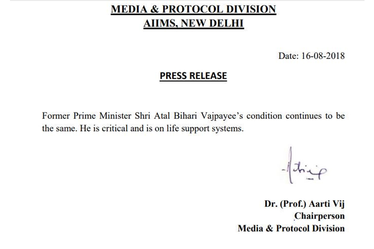 বাজপেয়ীর শারীরিক অবস্থা সম্পর্কে মেডিক্যাল বুলেটিন।