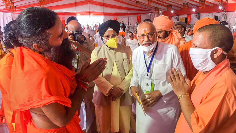 যোগগুরু রামদেবকে স্বাগত জানাচ্ছেন উত্তরপ্রদেশের মুখ্যমন্ত্রী যোগী আদিত্যনাথ। ছবি: পিটিআই