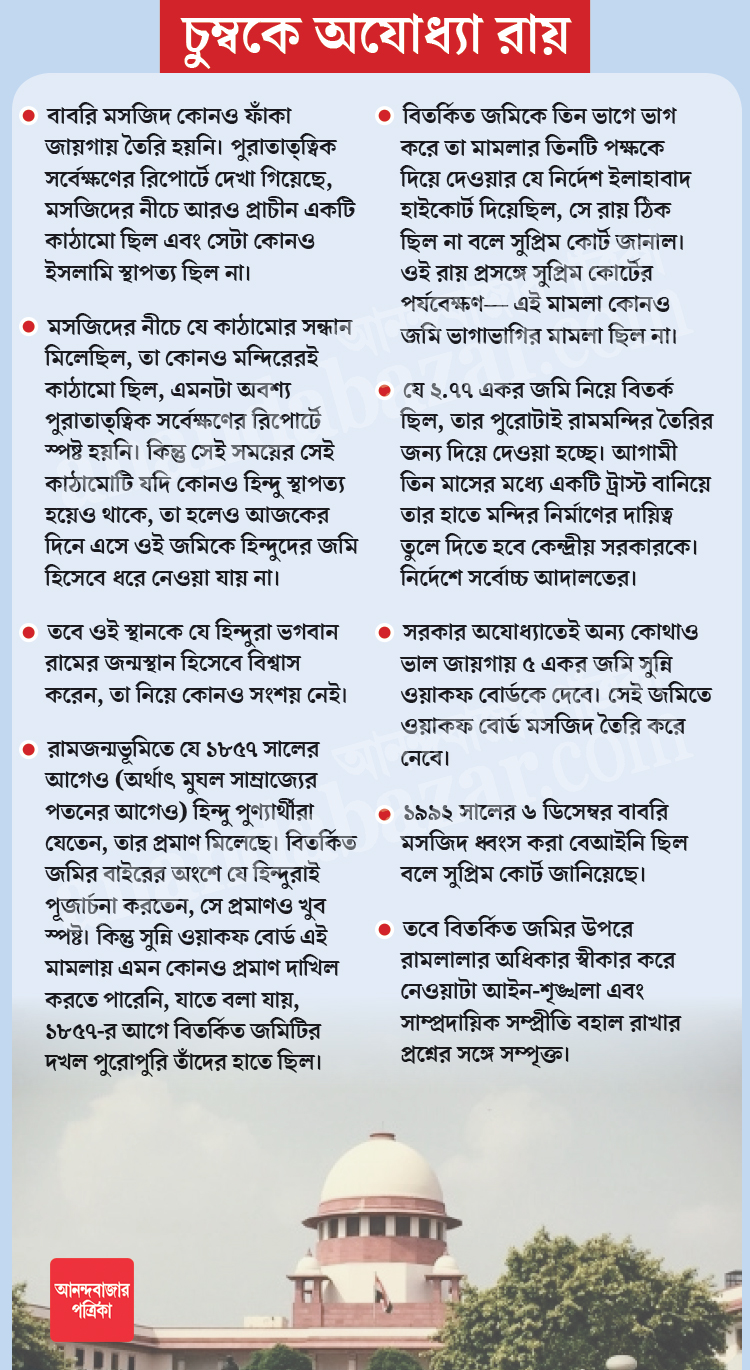 ঐকমত্যের ভিত্তিতে অযোধ্যা মামলার রায় দিলেন সর্বোচ্চ আদালতের পাঁচ বিচারপতি। রায় ঘোষণা করতে গিয়ে প্রথমেই জানালেন, মামলার অন্যতম পক্ষ শিয়া ওয়াকফ বোর্ডের কোনও দাবিই জন্মায় না ওই বিতর্কিত জমির উপরে। পরে জানানো হল, আর এক মামলাকারী নির্মোহী আখড়ার দাবিও খারিজ করে দেওয়া হচ্ছে। অতএব আইনি লড়াই পড়ে রইল রামলালা বিরাজমান এবং সুন্নি ওয়াকফ বোর্ডের। সে লড়াইয়ে বিতর্কিত জমির অধিকার পেলেন রামলালা বিরাজমান। অযোধ্যারই অন্য কোনও অংশে মসজিদ তৈরির জন্য বিকল্প জমির ব্যবস্থা করার নির্দেশও দিল সুপ্রিম কোর্ট।