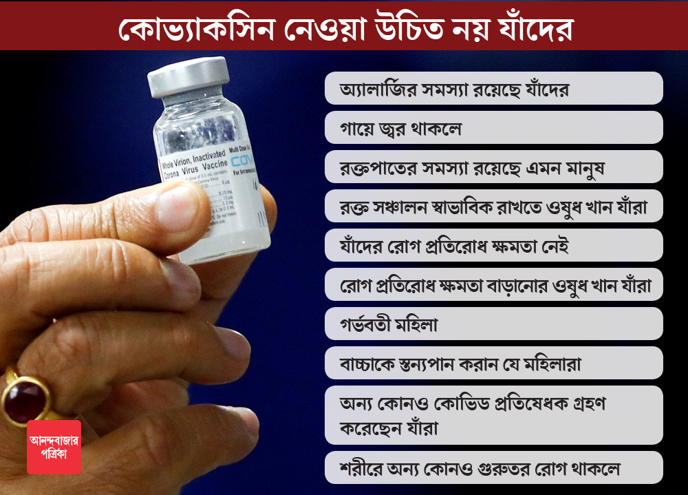 শুধু তাই নয়, জ্বর হলে, রক্তপাতের সমস্যা থাকলে, রক্ত সঞ্চালন স্বাভাবিক রাখার ওষুধ খেলে অথবা অন্য কোনও গুরুতর শারীরিক সমস্যা থাকলেও কোভ্যাকসিন নেওয়া নিরাপদ না-ও হতে পারে বলে জানানো হয়েছে ভারত বায়োটেকের তরফে। আগে অন্য কোনও করোনা প্রতিষেধক নিয়ে থাকলে কোভ্যাকসিন নেওয়া শ্রেয় নয় বলেও সতর্ক করা হয়েছে সাধারণ মানুষকে।