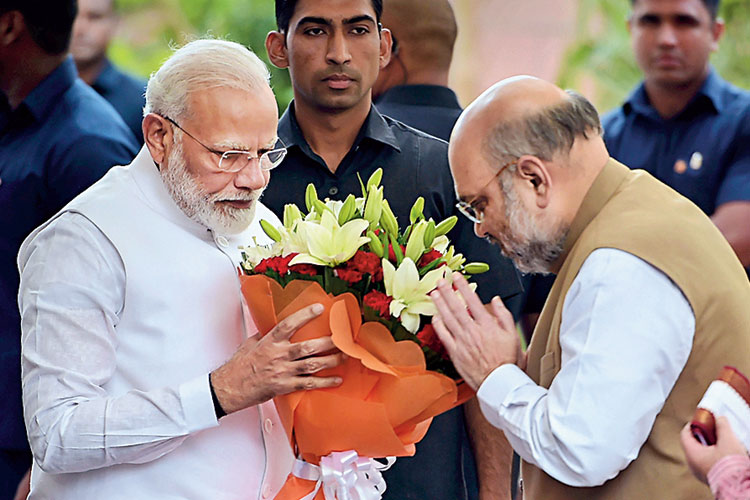 স্বাগত: বিজেপির কেন্দ্রীয় নির্বাচন কমিটির বৈঠকে নরেন্দ্র মোদীকে অভ্যর্থনা দলীয় সভাপতি অমিত শাহের। রবিবার নয়াদিল্লিতে। ছবি: পিটিআই।
