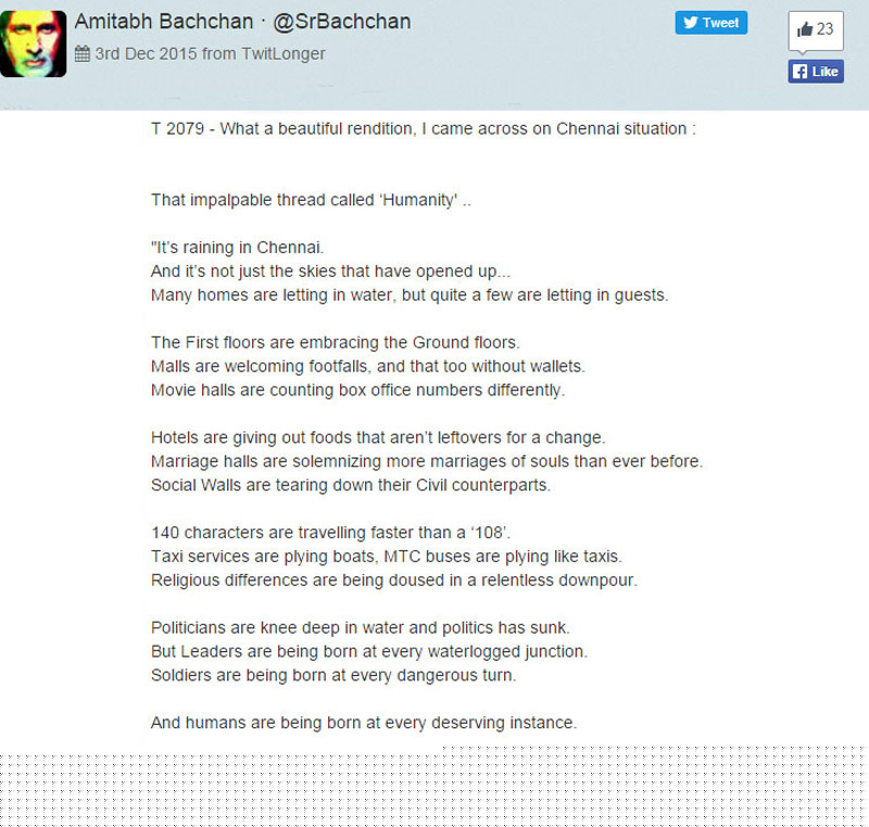 বন্যায় ভেসে যাচ্ছে চেন্নাই। ক্রমশ খারাপ হচ্ছে পরিস্থিতি। বলি-কলির অনেক তারকাই বাড়িয়ে দিয়েছেন সাহায্যের হাত। আর কলম তুলে নিয়েছেন অমিতাভ বচ্চন। চেন্নাইয়ের পরিস্থিতি নিয়ে কবিতা লিখলেন তিনি। বৃহস্পতিবার রাতে টুইটারে এই কবিতা পোস্ট করেছেন বিগ বি।