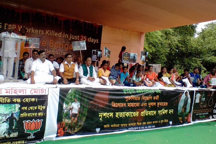 আক্রান্তদের নিয়ে ধর্না মঞ্চে বিজেপি নেতারা।