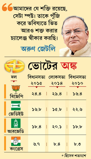 অতীতে ভোট বেশি পেয়েও আসন কম পাওয়ার ভূরি ভূরি নিদর্শন রয়েছে। গত লোকসভাতেই উত্তরপ্রদেশে ভোটের হিসেবে তৃতীয় স্থানে থেকেও একটিও আসন পাননি মায়াবতী। কিন্তু পরে স্থানীয় নির্বাচনগুলিতে তাঁর শক্তি দেখাতে পেরেছেন। বিজেপি নেতারা বলছেন, মহাজোট একজোট না হলে এ বারেও আসন বেরিয়ে যেত। গত লোকসভা ভোটে এনডিএ ৪০টির মধ্যে ৩১টি আসন পায়। বিধানসভার নিরিখে হিসেবে করলে ১৭২টি। কিন্তু যাবতীয় হিসেব গরমিল হয়ে গেল মহাজোট এক হওয়াতে এবং একে অন্যের ভোট পাইয়ে দিতে। জেটলি বলেন, ‘‘আমাদের যে শক্তি রয়েছে, তা স্পষ্ট। তাকে পুঁজি করে ভবিষ্যতে ভিত শক্ত করার চ্যালেঞ্জ স্বীকার করছি।’’