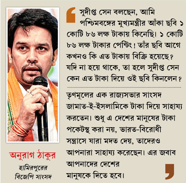 মদনের পরে মমতা! অনুরাগ বলে চলেন, “সুদীপ্ত সেন পশ্চিমবঙ্গের মুখ্যমন্ত্রীর আঁকা ছবি ১ কোটি ৮৬ লক্ষ টাকা দিয়ে কিনেছিলেন। ১ কোটি ৮৬ লক্ষ টাকা দামের পেন্টিং! তাঁর ছবি কি এত টাকায় আগে বিক্রি হয়েছিল? না হয়ে থাকলে সুদীপ্ত কেন এত টাকা দিয়ে ওই ছবি কিনলেন?” এই জন্যই মমতা সমস্ত পাঠাগারে সারদার সংবাদপত্র রাখার নির্দেশ দিয়েছিলেন কি না, প্রশ্ন তোলেন অনুরাগ। বলেন, “আপনাদের সাংসদরা সারদার সংস্থা থেকে মোটা বেতন পাচ্ছে। আর এক মন্ত্রী শ্যামাপ্রসাদ মুখোপাধ্যায়ের কারখানাও সুদীপ্ত সেন কিনেছিলেন। আর আপনারা দিল্লিতে এসে মানুষকে বিভ্রান্ত করতে চাইছেন!” অনুরাগ দাবি করেন, ভারত-বিরোধী সন্ত্রাসের কুশীলবদের সাহায্য করার জন্য দেশবাসীর কাছে জবাবদিহি করতে হবে তৃণমূলকে। এক ধাপ এগিয়ে তিনি বলেন, “তৃণমূলের আর এক সাংসদ জামাত-ই-ইসলামিকে টাকা দিয়ে সাহায্য করতেন। ইনিও সারদার সঙ্গে জড়িত। নামটা আপনারা বলবেন, না আমিই বলে দেব?”