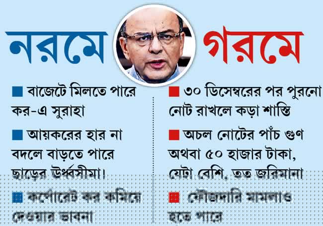 সরকারি সূত্র বলছে, মেয়াদ শেষের পরেও বাতিল নোটের আদানপ্রদানের মাধ্যমে সাময়িক ভাবে একটা সমান্তরাল অর্থনীতি চলতে পারে বলে রিজার্ভ ব্যাঙ্কের আশঙ্কা রয়েছে। তাই তারাই কড়া শাস্তির সুপারিশ করেছে। চলতি সপ্তাহেই কেন্দ্রীয় মন্ত্রিসভার বৈঠকে বিষয়টি উঠতে পারে। তবে নোট নিয়ে নাজেহাল আমজনতার একাংশের মনে যে অসন্তোষ জমা হয়েছে, তা বিলক্ষণ বুঝতে পারছেন সরকারের কর্তারা। সে জন্য কর ছাড় নিয়ে ভাবনাচিন্তা শুরু হয়েছে। অর্থ মন্ত্রক সূত্রের খবর, আয়কর ও কর্পোরেট কর, দুই ক্ষেত্রেই বোঝা কমানোর কথা ভাবা হচ্ছে। এখন আয়কর ছাড়ের ঊর্ধ্বসীমা আড়াই লক্ষ টাকা। তার পর থেকে আয়ের উপর ১০% হারে কর নেওয়া শুরু হয়। করের হার বদল না হলেও ছাড়ের ঊর্ধ্বসীমা কিছুটা বাড়তে পারে। এর মাধ্যমে মূলত মধ্যবিত্তদেরই সুরাহা দেওয়াই লক্ষ্য মোদী সরকারের।