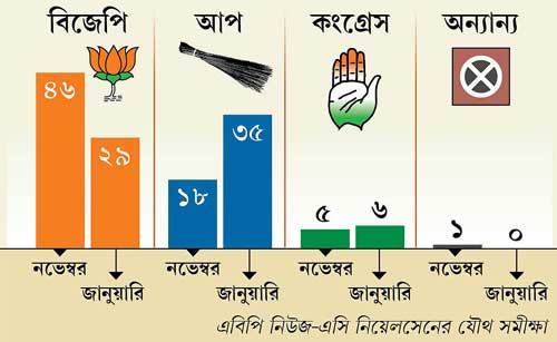 কিরণকে মুখ্যমন্ত্রী পদপ্রার্থী করার পর একের পর এক সমীক্ষায় দেখা যাচ্ছে বিজেপির হাল খারাপ হচ্ছে। গত নভেম্বরে এবিপি-নিউজ এবং এসি নিয়েলসেনের যৌথ সমীক্ষায় দেখা গিয়েছিল বিজেপি ৪৬টি এবং আপ ১৮টি আসন পেতে পারে। কিন্তু জানুয়ারির শেষ সপ্তাহে দেখা গিয়েছে, বিজেপি ২৯ ও আপ ৩৫। অর্থাৎ আপ গরিষ্ঠতার চেয়ে ১টি আসনে পিছিয়ে। তাদের নেতা যোগেন্দ্র যাদব বলছেন, “হারছেন বুঝে বিজেপি নেতারা দিশাহারা। তাই কাদা ছুড়তে শুরু করেছেন। এটা প্রত্যাশিতই ছিল।” বিজেপি নেতারা বলছেন, ওই সমীক্ষা হয়েছে নরেন্দ্র মোদী প্রচারে নামার আগে। তিনি নিজে প্রচারে নামায় ছবিটা এ বার পাল্টে যাবে। দিল্লিতে কাল ফের সভা করবেন মোদী।