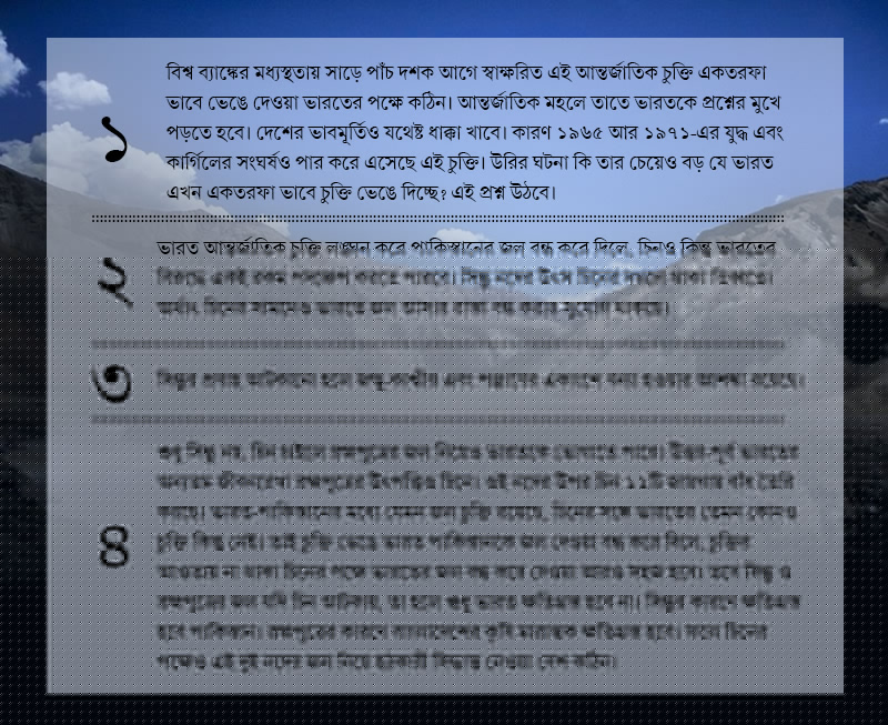 তবে সিন্ধু ও ব্রহ্মপুত্রের জল যদি চিন আটকায়, তা হলে শুধু ভারত ক্ষতিগ্রস্ত হবে না। সিন্ধুর কারণে ক্ষতিগ্রস্ত হবে পাকিস্তান। ব্রহ্মপুত্রের কারণে বাংলাদেশের কৃষি মারাত্মক ক্ষতিগ্রস্ত হবে। ফলে চিনের পক্ষেও এই দুই নদের জল নিয়ে হঠকারী সিদ্ধান্ত নেওয়া বেশ কঠিন।