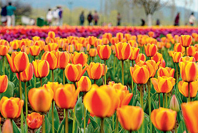 ফুলে ফুলে...। মঙ্গলবার শ্রীনগরের টিউলিপ বাগানে। ছবি: এএফপি।