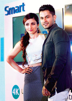 সস্ত্রীক। মঙ্গলবার মুম্বইয়ে একটি অনুষ্ঠানে কুণাল খেমুর সঙ্গে সোহা আলি খান। ছবি: পিটিআই।
