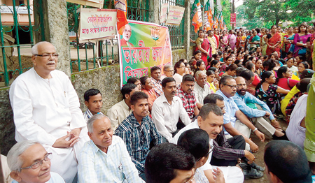 জেলাশাসকের দফতরের সামনে বিজেপির ধর্না। শুক্রবার শিলচরে। ছবি: স্বপন রায়।