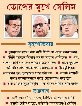 যাঁর জন্য এত কাণ্ড, তাঁর নম্বরে অবিরাম ডায়াল করে যাচ্ছেন সেলিম। কিন্তু পি করুণাকরনের মোবাইল বন্ধ! অবশেষে সেলিম দ্বারস্থ হলেন ইয়েচুরি এবং বুদ্ধবাবুর। ঠিক হল, বুদ্ধবাবুই শেষ পর্যন্ত বিবৃতি জারি করবেন। তা-ই হল। নাকচ হয়ে গেল করুণাকরনের সিদ্ধান্ত। স্বস্তির শ্বাস পড়ল আলিমুদ্দিনে! কেন না, বিমান বসুরা নবান্নে গিয়ে ফিশ ফ্রাই-কফিতে আপ্যায়িত হয়ে আসার পরে দলে প্রশ্ন উঠতে শুরু করেছিল, এ বার কি তবে সিপিএম এ রাজ্যে তৃণমূলের বি-টিমে পরিণত হচ্ছে? বুদ্ধবাবুর বিবৃতি স্পষ্ট করে দিল বিজেপি নয়, পশ্চিমবঙ্গে সিপিএমের প্রধান শত্রু তৃণমূলই।