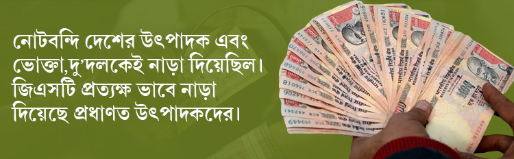 এর ফল হয়েছে দু’প্রকার। বেশ কিছু অসংগঠিত ক্ষেত্রে উৎপাদন হ্রাস পেয়েছে। বাজার মূল্যে জাতীয় আয়ের বৃদ্ধির হার ২০১৬-১৭-র প্রথম দুই ত্রৈমাসিকের তুলনায় যথেষ্ট কম। জুলাই থেকে সেপ্টেম্বর এই তিন মাসে ২০১৬-১৭তে এটা ছিল ৭.৫ শতাংশ আর ২০১৭-১৮তে তা হয়েছে ৬.৩ শতাংশ। আর এপ্রিল থেকে জুন এই তিন মাসে এই হার ছিল যথাক্রমে ৭.৯ শতাংশ আর ৫.৭ শতাংশ। এই হ্রাস কিন্তু শুধু জিএসটির জন্য নয়— এটা নিশ্চয় ‘নোটবন্দি’র দীর্ঘস্থায়ী প্রভাবও বটে, কারণ জিএসটি চালু হয়েছে ১লা জুলাই ২০১৭ থেকে। কিন্তু, জিএসটির প্রভাবও যে অসংগঠিত ক্ষেত্রে পড়েছে তা বেশিরভাগ বিশেষজ্ঞেরই মত।