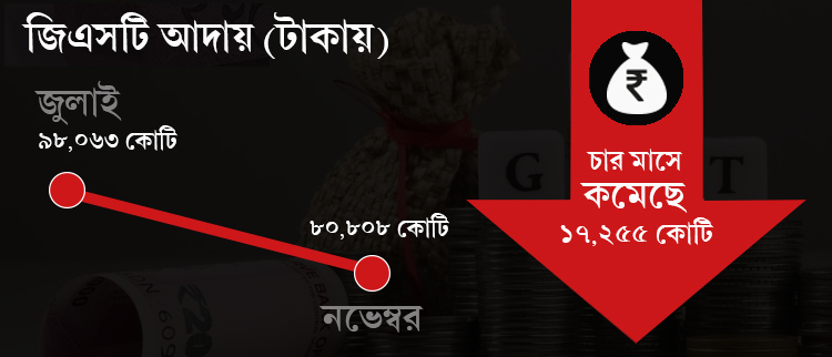 অন্য চিন্তার ব্যাপার হয়েছে জিএসটির ফলে কর আদায়ের ক্ষেত্রে। সরকারি তথ্য বলছে— গত জুলাই মাসে জিএসটি থেকে কর আদায়ের পরিমাণ যেখানে ছিল ৯৮,০৬৩ কোটি টাকা, তা নভেম্বর মাসে কমে গিয়ে দাঁড়িয়েছে ৮০,৮০৮ কোটিতে। সরকার এর পিছনে দু’টি প্রধান যুক্তি দেখিয়েছে— এক হল জিএসটি হার অনেক পণ্যের ক্ষেত্রে কমানো হয়েছে আর দ্বিতীয়ত, ছোট অসংগঠিত উৎপাদকরা অনেক কম সংখ্যায় নাম নথিবদ্ধ করছে।