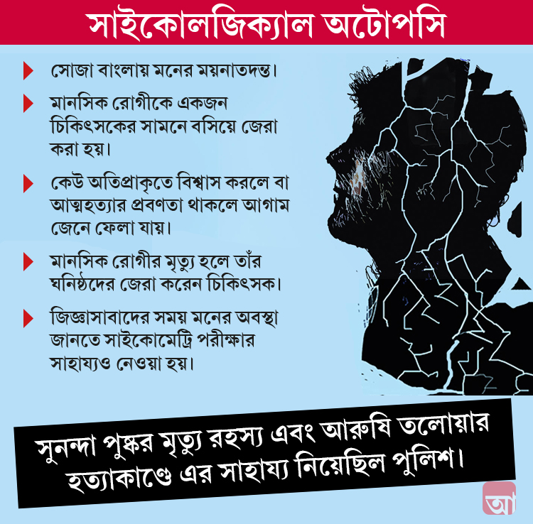 মনের ময়নাতদন্ত। বুরারি গণ ‘আত্মহত্যা’ কাণ্ডের জট খুলতে এ বার এই পদ্ধতিরই প্রয়োগ করতে চলেছে পুলিশ। মৃত্যুর কারণ জানতে শরীরের কাটাছেঁড়া করে পুলিশ। বুরারির ভাটিয়া পরিবারের মৃত্যু-রহস্য উন্মোচনে অনেকটা সেই ধাঁচেই পরিবারের ঘনিষ্ঠদের মনের কাটাছেঁড়া করবে পুলিশ। চিকিৎসা বিজ্ঞানে যার নাম ‘সাইকোলজিক্যাল অটোপসি’।