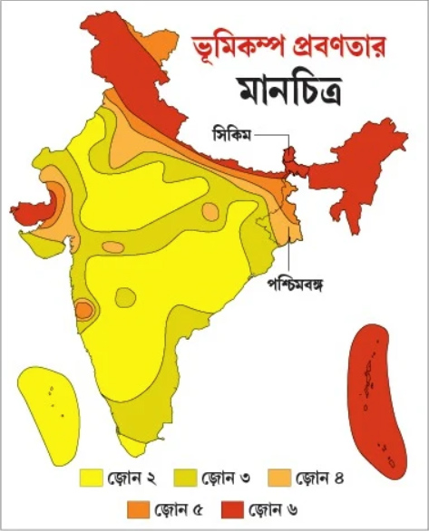 সম্প্রতি দেশের ভূমিকম্পপ্রবণ এলাকার নতুন মানচিত্র প্রকাশ করেছে ব্যুরো অব ইন্ডিয়ান স্ট্যান্ডার্ডস (বিআইএস)। সেই মানচিত্রে কাশ্মীর থেকে উত্তর-পূর্বাঞ্চল, পুরো অঞ্চলকেই ভূমিকম্পপ্রবণতার নিরিখে ‘জ়োন-৬’-এ ফেলা হয়েছে। অর্থাৎ, অতি প্রবল মাত্রার ভূমিকম্প হওয়ার আশঙ্কা আছে এই এলাকায়। এই ‘জ়োন’-এর মধ্যে দার্জিলিং-সহ পশ্চিমবঙ্গের পাহাড় ও তরাইয়ের জেলাগুলিও আছে। আছে প্রতিবেশী রাজ্য সিকিমের সব এলাকা এবং বিহারের উত্তরাঞ্চল। ভূতত্ত্ববিদেরা জানান, লে-লাদাখ বাদে দেশের মানচিত্রের পুরো মাথাই অতি ভূকম্পপ্রবণ এলাকায় পড়েছে। আন্দামান-নিকোবরও ভূমিকম্পের আশঙ্কার সর্বোচ্চ স্তরে আছে।