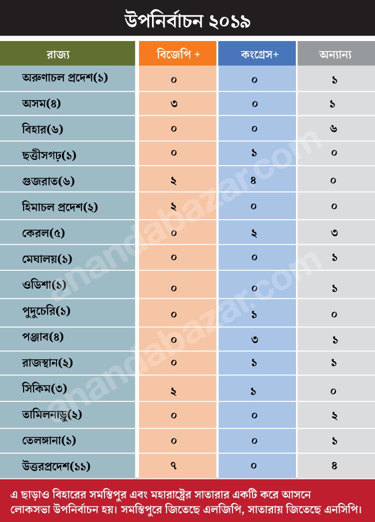মহারাষ্ট্র ও হরিয়ানা বিধানসভা ভোটের মতো ১৭টি রাজ্য ও কেন্দ্রশাসিত অঞ্চল পুদুচেরীর ৫১টি বিধানসভা ও দু’টি লোকসভা আসনের উপনির্বাচনের ফলাফলেও থাকল কিছুটা চমক। ৩০টি বিধানসভা আসনের উপনির্বাচনে বিজেপি ও তার শরিক দলগুলি এগিয়ে থাকলেও হাতে থাকা দু’টি রাজ্য বিহার ও গুজরাতে কিছুটা হতাশ হতে হল বিজেপিকে।