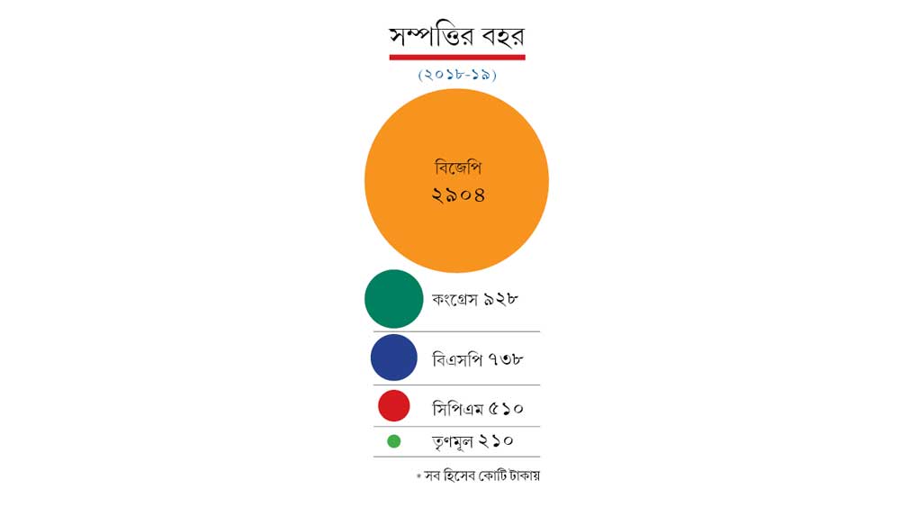 গত লোকসভা ভোটের ঠিক ঠিক আগের বছরে (২০১৮-১৯ অর্থবর্ষে) বিজেপির সম্পত্তির পরিমাণ ছিল দ্বিতীয় স্থানে থাকা কংগ্রেসের তিন গুণেরও বেশি। জাতীয় রাজনৈতিক দলগুলির মোট সম্পত্তির ৫৪% ছিল তাদের দখলে!
