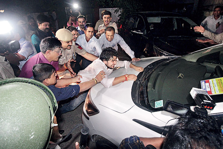 আগামিকাল রাজীব গাঁধীর জন্মবার্ষিকীর অনুষ্ঠান রয়েছে দিল্লিতে। সে জন্য গোটা দেশ থেকে আসা যুব কংগ্রেস সদস্যেরা ভিড় করেছিলেন কংগ্রেস দফতরে। সিবিআই চিদম্বরমের বাড়িতে পৌঁছেছে জানতে পেরে তাঁদের একটি বড় অংশ পৌঁছে যায় সেখানে। ভিতরে যখন চিদম্বরম ও সিবিআই অফিসারদের বৈঠক চলছে, তখন বাইরে মোদী-অমিত শাহের বিরুদ্ধে ক্ষোভ উগরে দিতে শুরু করেছেন কংগ্রেস সমর্থকেরা। ‘মোদী তেরি তানাশাহি-গুন্ডাগিরি নেহি চলেগি’— স্লোগানের মধ্যেই চিদম্বরমকে মাঝের আসনে বসিয়ে বেরিয়ে আসে সিবিআইয়ের গাড়ি। বাঁধ ভাঙে সমর্থকদের। বনেটের উপরে ঝাঁপিয়ে পড়েন কেউ কেউ। কেউ শুয়ে পড়েন রাস্তায়। লাঠি নিয়ে তেড়ে যায় দিল্লি পুলিশ। তারই ফাঁকে সিবিআইয়ের গাড়ি দৌড় দেয় লোদী রোডে সিবিআই সদর দফতরের দিকে। সেখানেও ভিড়ের আশঙ্কায় পিছনের গেট দিয়ে ঢোকান হয় গাড়ি।