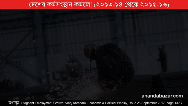 অর্থনৈতিক বৃদ্ধি-হারের এতটা কমে যাওয়া সত্যিই খুব চিন্তার। কিন্তু সমস্যাটা বোধহয় আরও একটু গভীরে। অর্থনৈতিক সম্প্রসারণ হলেই যে সাধারণ মানুষের হাতে কাজ আসবে, আয় বাড়বে- এমন গ্যারাণ্টি নেই। হতেও পারে, না-ও হতে পারে। বৃদ্ধির চরিত্র এখানে গুরুত্বপূর্ণ নির্ধারক। অর্থাৎ, বৃদ্ধি কোথায় হল, শ্রমনিবিড় ক্ষেত্রে না উচ্চমার্গের উৎপাদনকে ঘিরে, সেটাই মূল প্রশ্ন। আর ঠিক এখানেই লুকিয়ে আছে আরও বড় একটা সমস্যা– যা হয়ত অনেকের নজর এড়িয়ে যাচ্ছে। কয়েক মাস আগে ইপিডব্লিউ (ইকনমিক অ্যান্ড পলিটিক্যাল উইকলি)-তে এই উদ্বেগজনক জায়গাতেই আলোকপাত করেছেন ভিনোজ আব্রাহাম। দেশে কর্মসংস্থান বৃদ্ধির হার আগেও কমেছে, কিন্তু এ বার কর্মসংস্থানই কমছে।