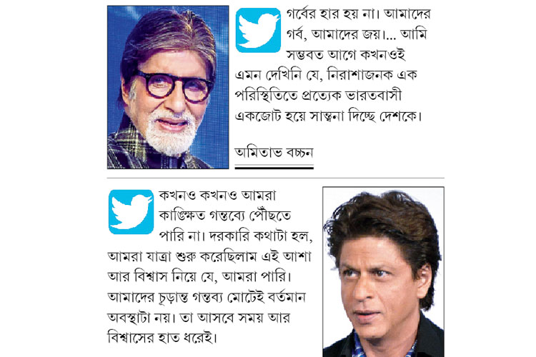 কেবল বিদ্রুপকে উড়িয়ে দেওয়াই নয়, ইসরোর জন্যও সহমর্মিতা, সমর্থনের বাঁধ ভাঙে টুইটারে। কান্নায় ভেঙে পড়া ইসরো চেয়ারম্যান কে শিবনকে বুকে জড়িয়ে ধরে প্রধানমন্ত্রী নরেন্দ্র মোদীর সান্ত্বনা দেওয়ার ভিডিয়োও ভাইরাল হয় সকাল থেকে। ট্রেন্ডিং তালিকায় সন্ধে অবধি দাপিয়েছে #ইসরোপরগর্বহ্যায়, #প্রাউডঅবইসরো-র মতো হ্যাশট্যাগ। অমিত শাহ, পীযূষ গয়াল, নির্মলা সীতারামনের মতো কেন্দ্রীয় মন্ত্রীরা তো বটেই, রাহুল গাঁধী, মমতা বন্দ্যোপাধ্যায়, অরবিন্দ কেজরীবাল, এম কে স্ট্যালিনের মতো বিরোধী নেতারাও ইসরোর বিজ্ঞানীদের পক্ষে সমর্থন উজাড় করে দেন টুইটারে।