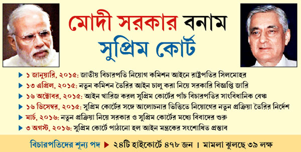 সুপ্রিম কোর্ট মোদী সরকারের বিচারপতি নিয়োগ কমিশন আইন খারিজ করে দেওয়ার পর থেকেই নতুন নিয়োগ প্রক্রিয়াকে ঘিরে সরকার বনাম শীর্ষ আদালতের পাঁচ প্রবীণতম বিচারপতিকে নিয়ে তৈরি কলেজিয়ামের পাঞ্জার লড়াই চলছে। নতুন নিয়োগ প্রক্রিয়া ঠিক না হওয়া পর্যন্ত পুরনো পদ্ধতিতে নিয়োগ চলবে বলে ঠিক হয়েছিল। কিন্তু শুক্রবার শীর্ষ আদালত প্রশ্ন তোলে, ফেব্রুয়ারি থেকে কেন্দ্রের কাছে ৭৫ জনের নাম পাঠানো হলেও তা নিয়ে সিদ্ধান্ত হয়নি। ফলে ২৪টি হাইকোর্টে ৪৭৮টি বিচারপতির পদ ফাঁকা পড়ে রয়েছে। সুপ্রিম কোর্ট ও হাইকোর্টগুলিতে ৩৯ লক্ষের বেশি মামলা ঝুলে রয়েছে। আজ স্বাধীনতা দিবসের অনুষ্ঠানে প্রধান বিচারপতি বলেন, ‘‘ব্রিটিশ জমানায় দশ বছরে কোনও মামলার রায় আসত। কিন্তু এখন বিচারপতির অভাবে একশো বছরও যথেষ্ট নয়!’’