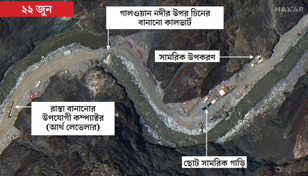 সম্প্রতি একটি বিদেশি সংস্থা প্রকাশিত ২১ মে তোলা উপগ্রহ চিত্রে দেখা গিয়েছে, সে সময় গালওয়ান নদীর তীরে মাত্র একটি চিনা তাঁবু ছিল। ওই সংস্থারই ২২ জুনের উপগ্রহ চিত্র দেখাচ্ছে, সেখানে পুরোদস্তুর কংক্রিটের কালভার্ট বানিয়েছে চিন। আশপাশে ছড়িয়ে-ছিটিয়ে রয়েছে পিপলস লিবারেশন আর্মির তাঁবু ও অন্যান্য নির্মাণ, গাড়ি এবং সামরিক উপকরণ। পাহাড়ের গায়ে চিনা সেনার থাকার ঘরও তৈরি। দারবুক-দৌলত বেগ ওল্ডি সড়কের মাত্র ছ’কিলোমিটার দূরে, ১৫ জুনের সংঘর্ষস্থল পেট্রোলিং পয়েন্ট ১৪-র অদূরে চিনা বাহিনীর এই অবস্থান।